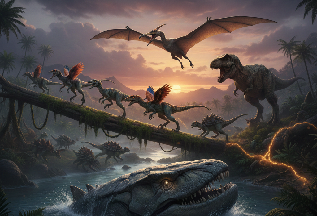 The reign of dinosaurs ended abruptly around 66 million years ago, when a massive asteroid struck Earth. The impact triggered fires, tsunamis, and a global climate catastrophe. Sunlight was blocked, temperatures plummeted, and food chains collapsed.