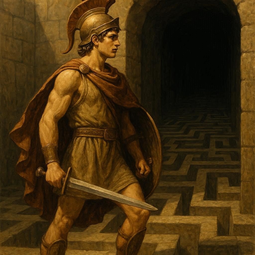 The day came when Theseus entered the Labyrinth. The heavy doors closed behind him, and he stepped into the dark corridors of Daedalus’ masterpiece. Every turn seemed endless, every wall echoed with silence, and the weight of death hung over him.